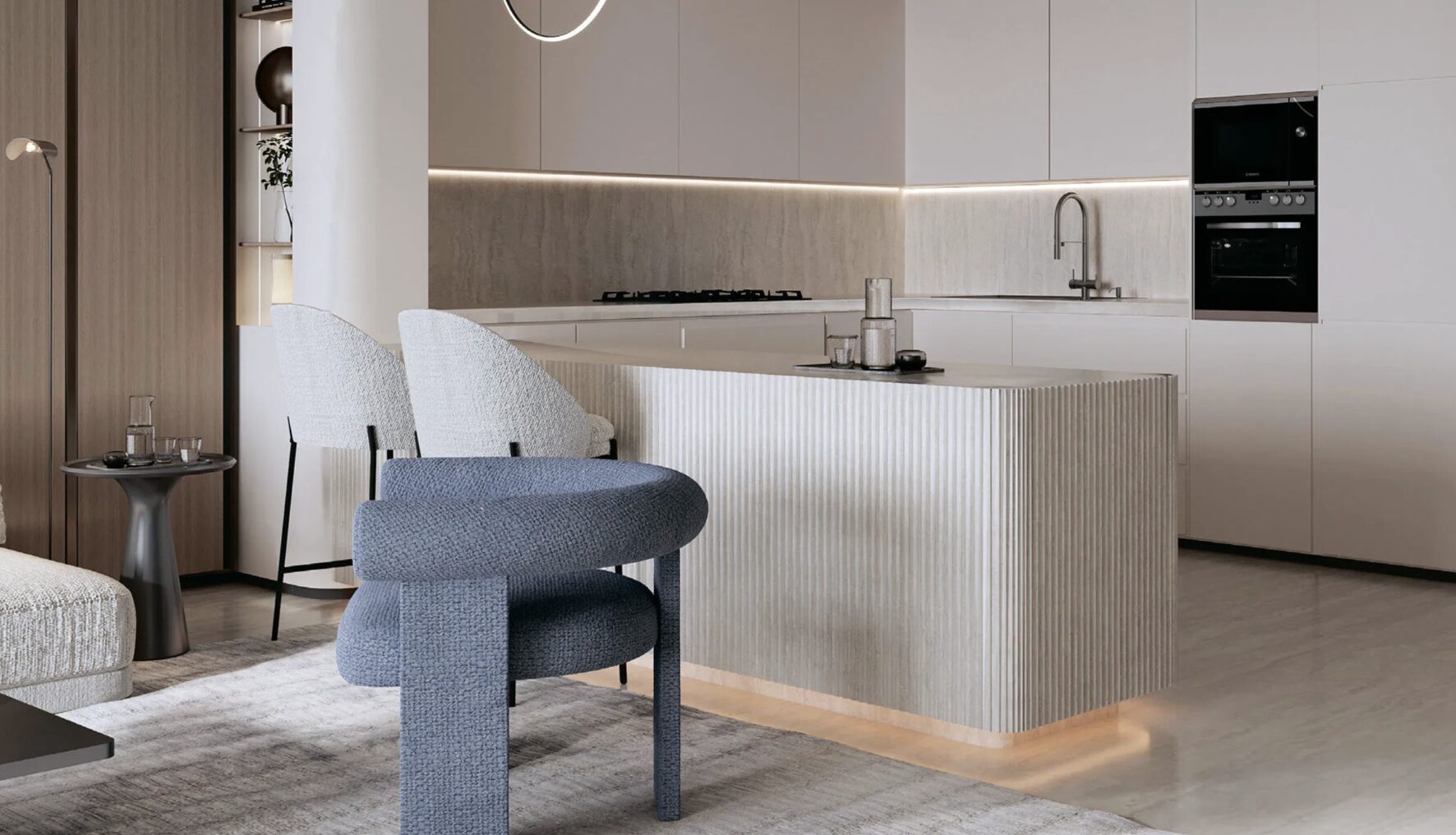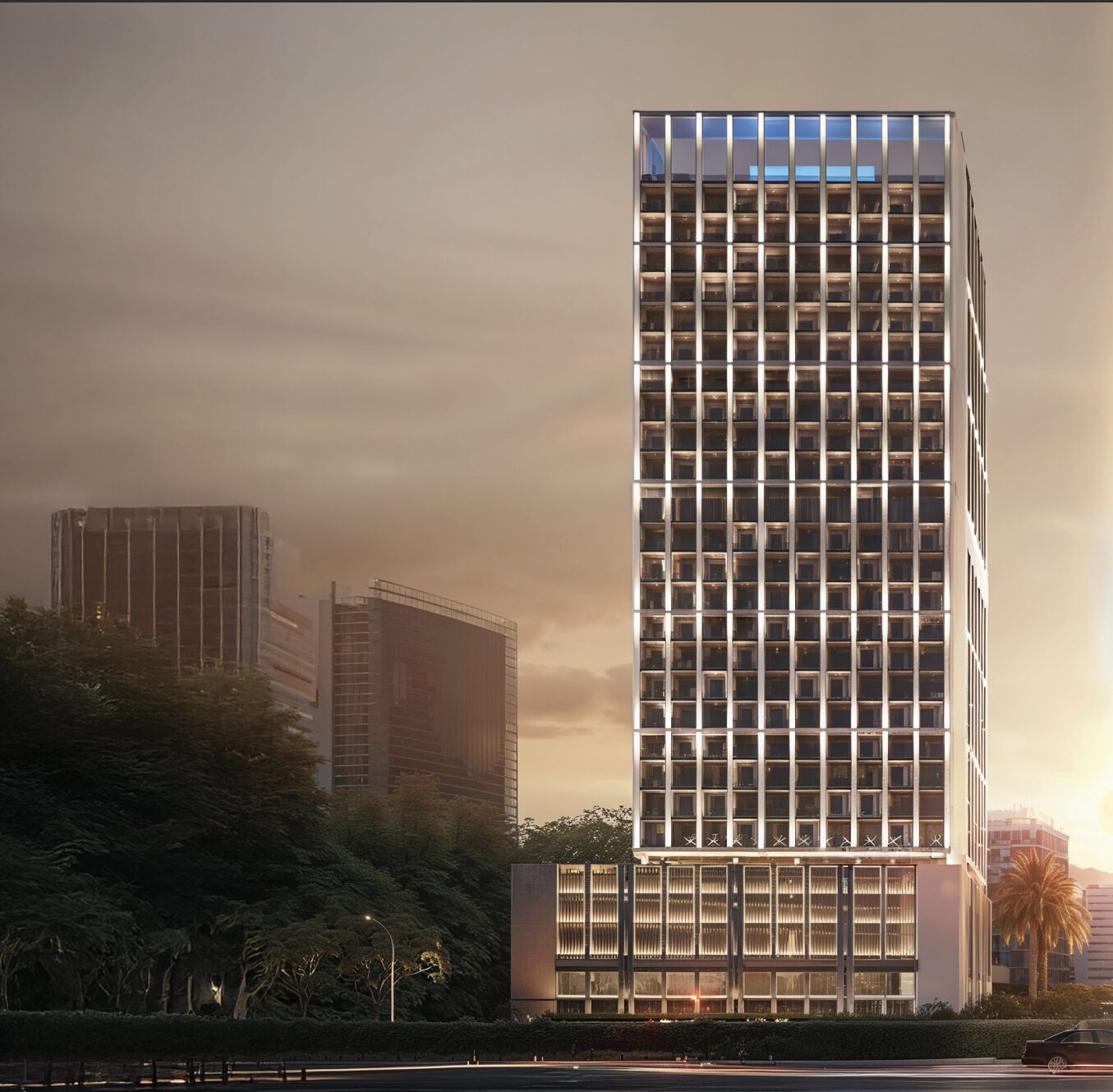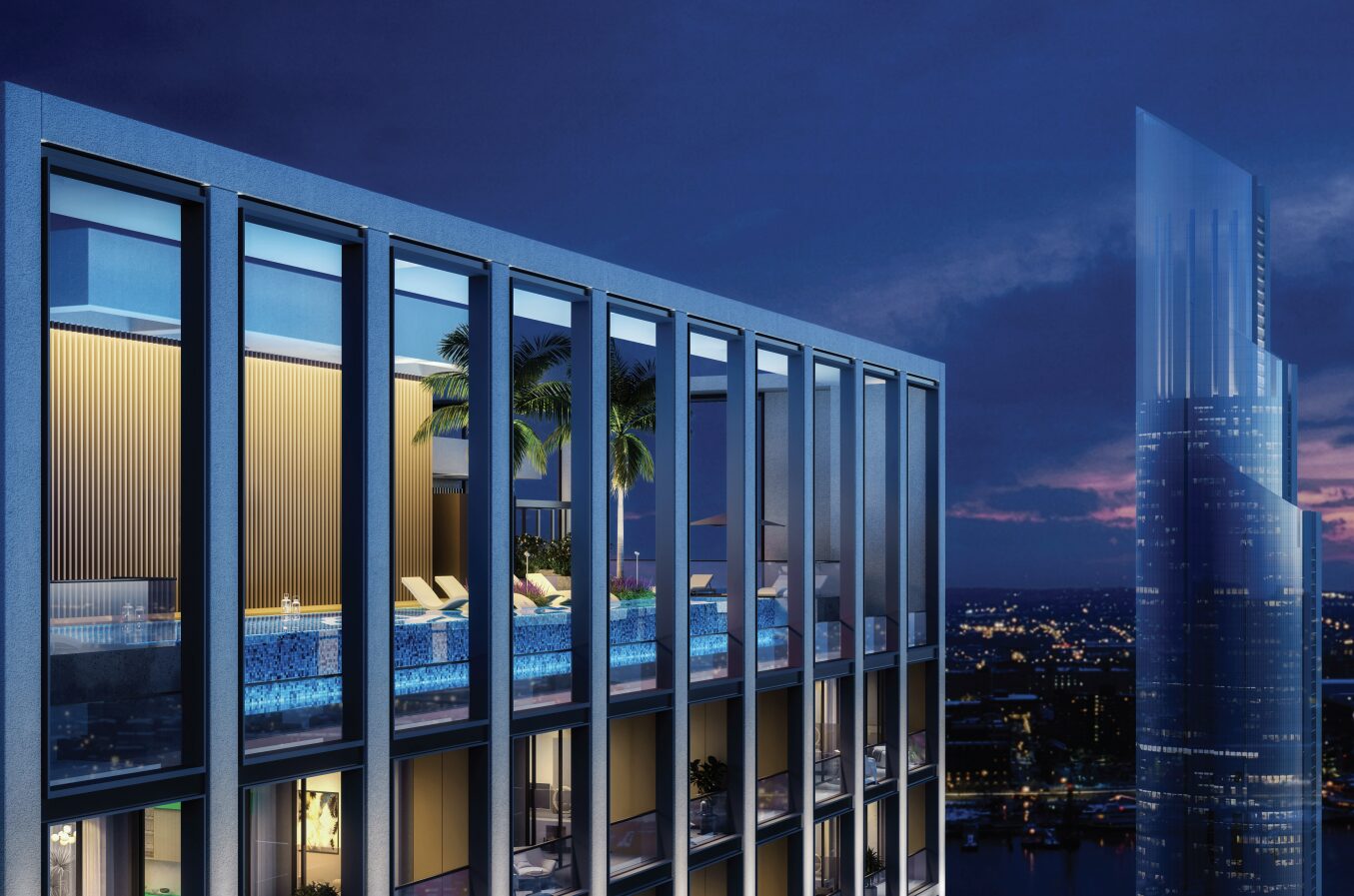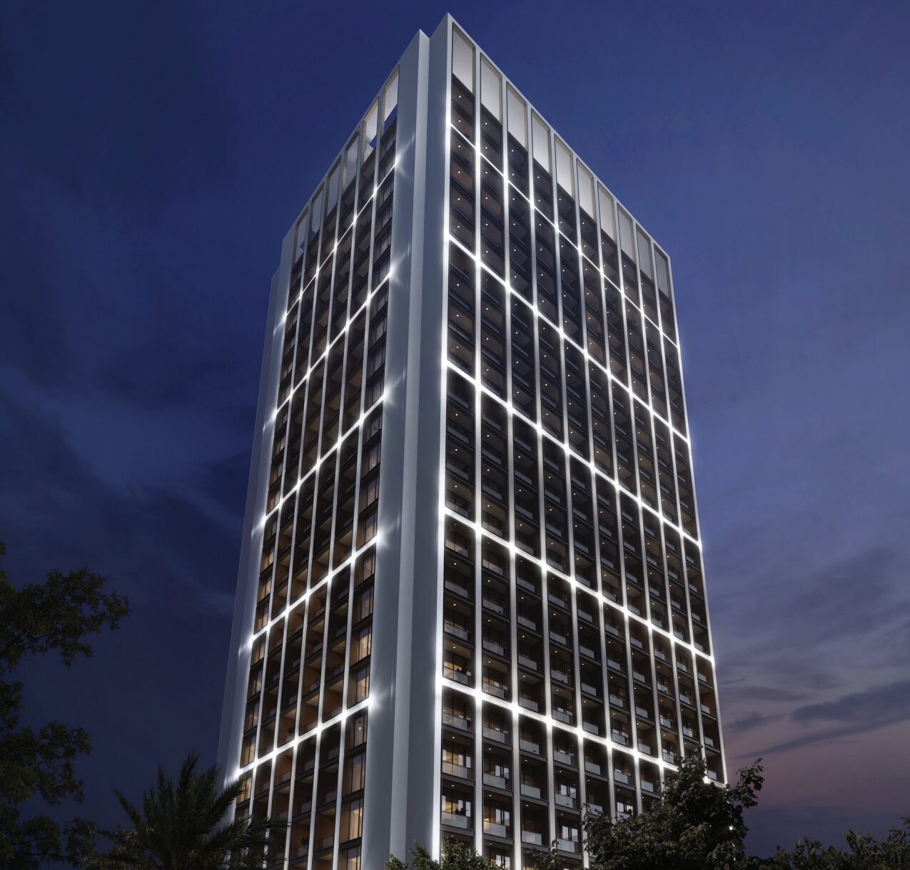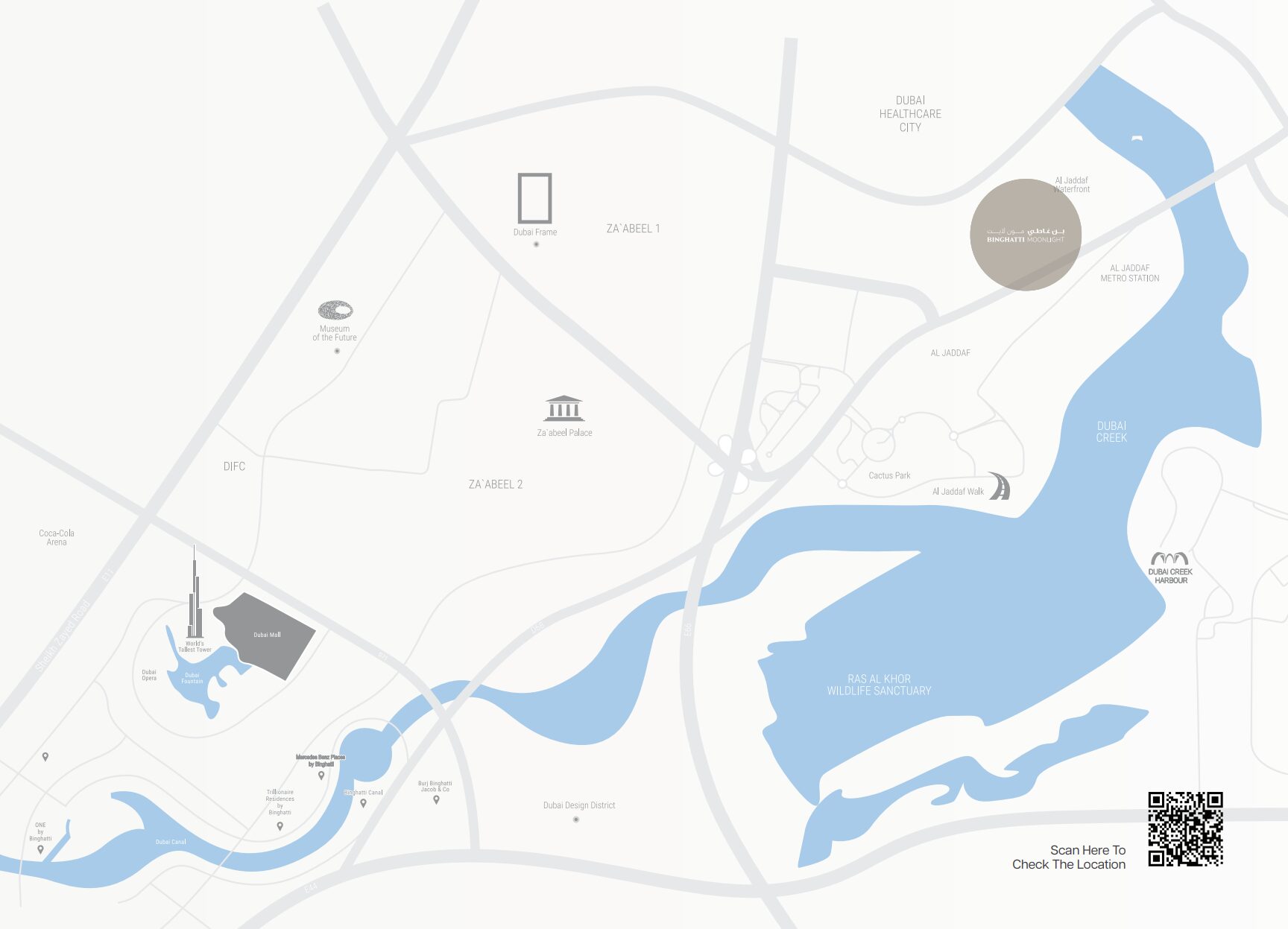 Binghatti Moonlight is a 25-storey mixed-use development by Binghatti Developers, located in Al Jaddaf Waterfront. Its stunning crystalline glass façade, inspired by the gentle glow of moonlight, features unique geometric design that plays with natural light throughout the day. The development comprises 236 residential apartments (1–3 BR), 47 office suites, and 3 retail outlets. Smart home integration, AI-based technology, and natural materials — travertine, light oak, brass, and Patagonia marble — elevate the living experience. Residents enjoy panoramic views of Dubai Creek Harbour, Downtown Dubai, and iconic landmarks from a rooftop infinity pool.